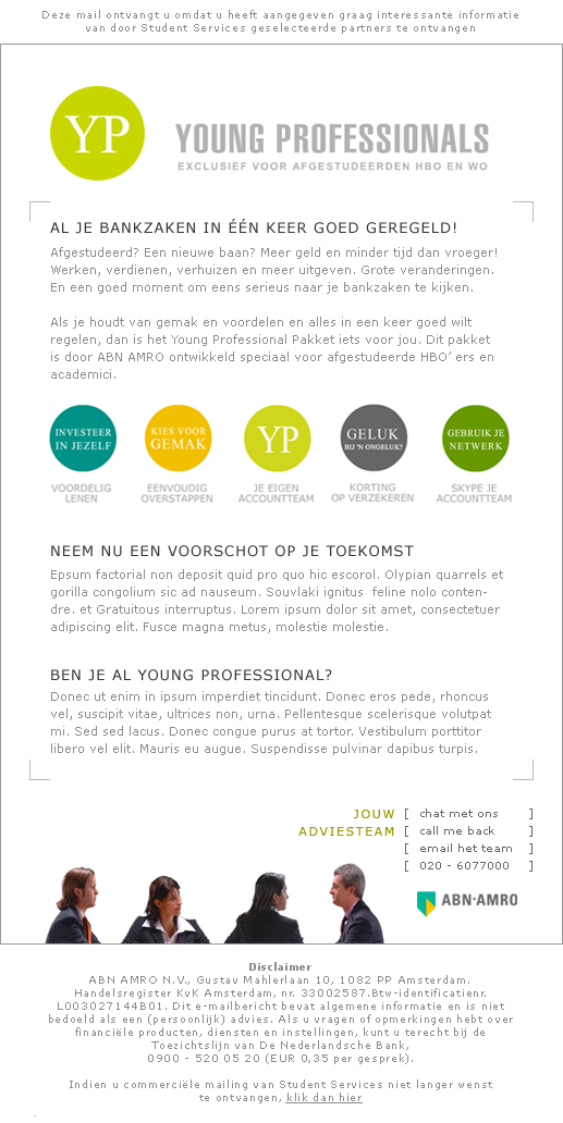 For ABN AMRO Young Professional I created a newsletter showcasing the easy way of communicating with a personal account-team. Contacting a representative through chat, call me back, phone or email covers all communication possibilities.
