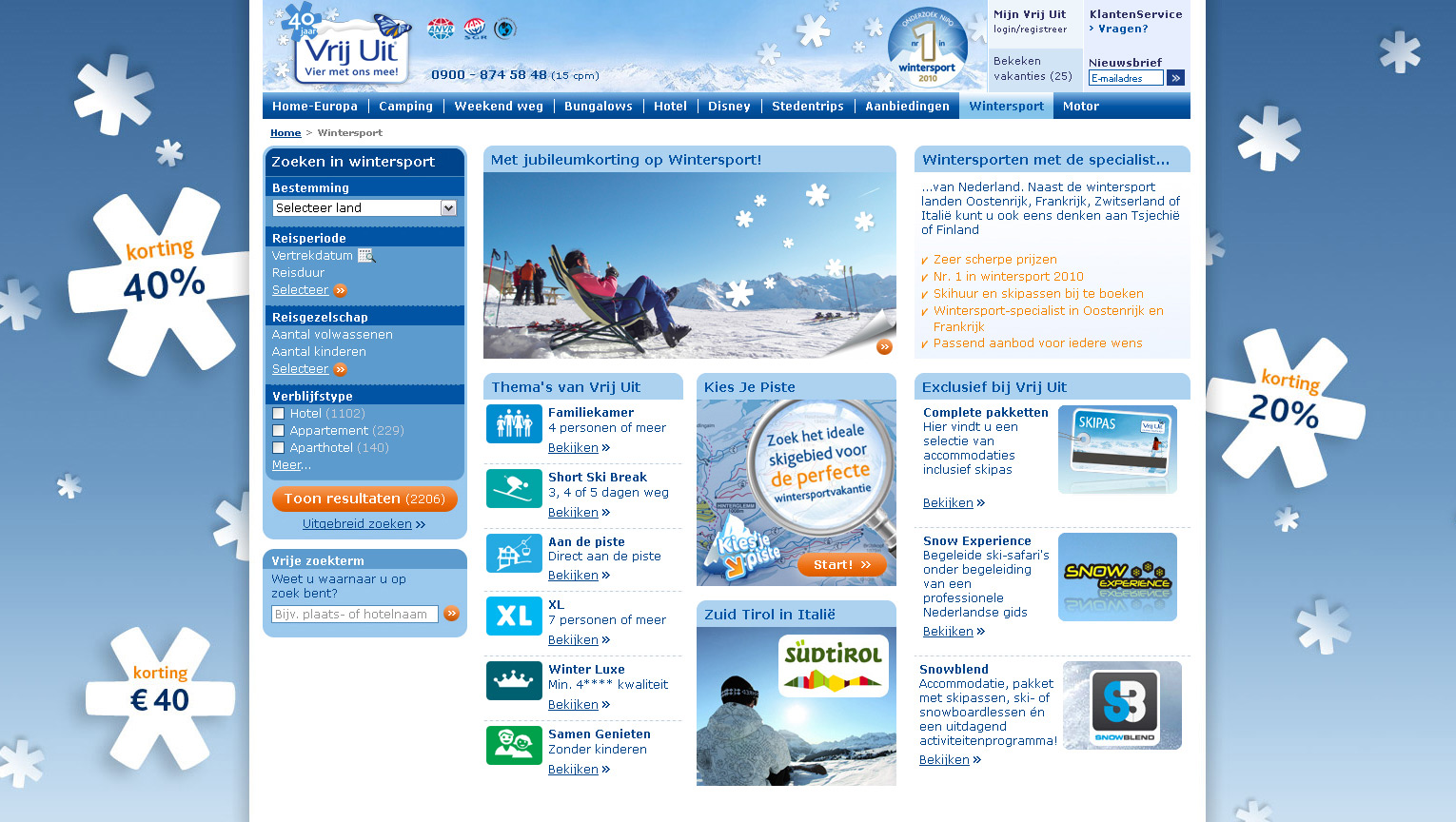 For the Vrij Uit wintersports campaign I created a channel-page with the visual elements of the campaign throughout the page: in the background, header and banners. I also created a flash-animation with a count-down to a set date to get more traffic to the Last minute offers and a set of affiliate banners.