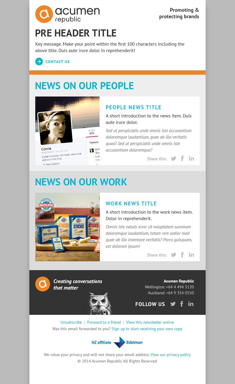 This new fully responsive website design for PR / marketing agency Acumen Republic was part of the rebranding project that I was responsible for. Simple, clean, modern and functional. Consistent with the website I created a DM (newsletter) based on recent best practice research.