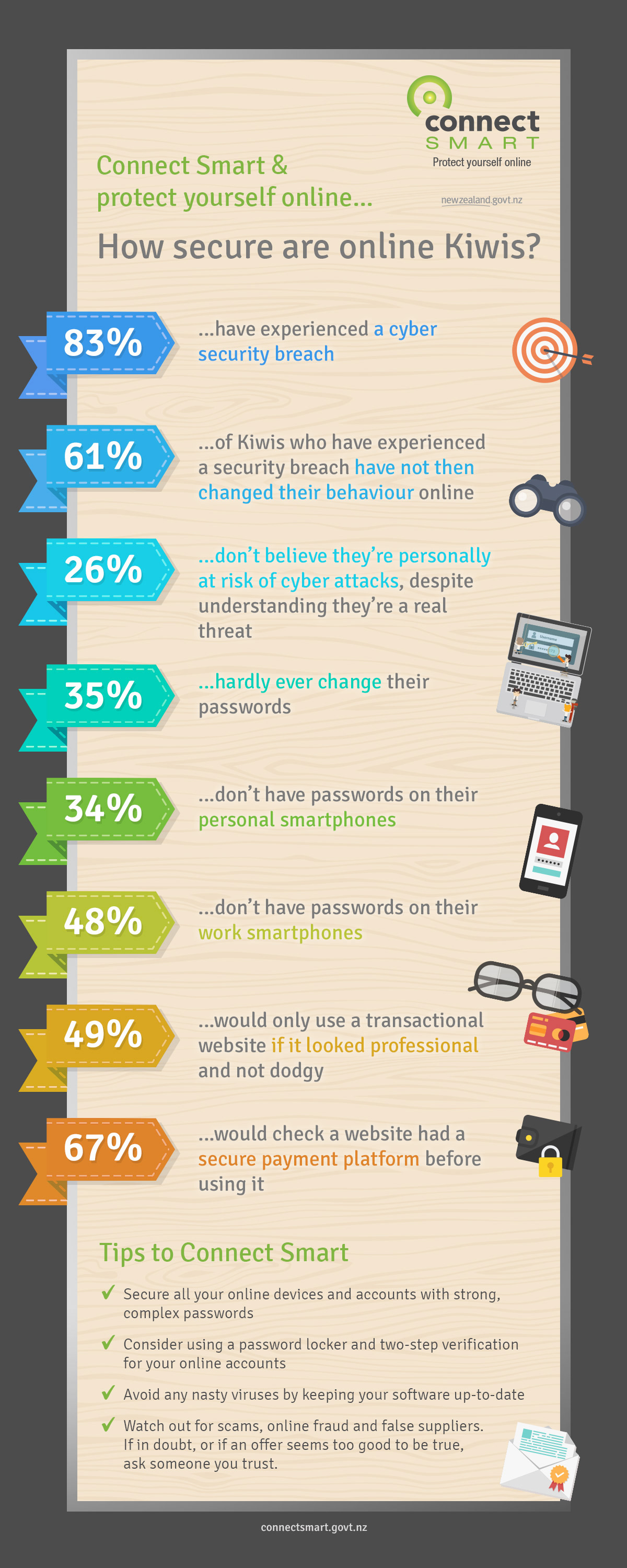 How secure are online Kiwis? Interesting facts about online behaviour formatted in a modern, colourful and playful layout. Separate messages were extracted daily to be featured on the Facebook page during the Cyber Security Awareness Week for The Department of Prime Minister & Cabinet.