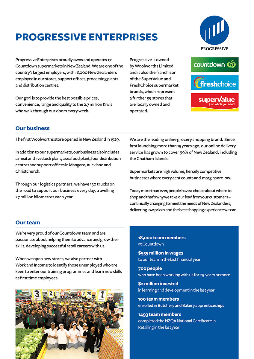 A 2-sided document promoting Progressive Enterprises to be handed out at a corporate event. There was no brand style guide, so I chose the fonts and colour scheme matching the existing logo and brand feel.